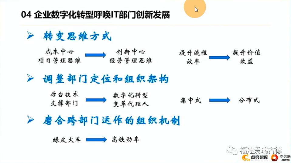 所以說,轉(zhuǎn)型需要轉(zhuǎn)變什么呢?轉(zhuǎn)變思維方式,對于IT部門也好,還是公司領(lǐng)導(dǎo)也好,要從傳統(tǒng)的成本中心的項目管理思維變成創(chuàng)新中心的經(jīng)營思維。從提升流程效率到提升企業(yè)的價值效益,另外要調(diào)整部門的定位和組織架構(gòu)。一個部門從后臺的技術(shù)支撐部門要變成什么呢?變成數(shù)字轉(zhuǎn)型變革的代理人。組織上也可以從集中式變成分布式。現(xiàn)在已經(jīng)很多企業(yè)在這樣做了,不管叫IT專員也好,或者叫什么,在各個業(yè)務(wù)部門有相應(yīng)的崗位,至于這個崗位是由業(yè)務(wù)部門管還是由IT部門管,都有。但是深入到一線,關(guān)鍵的是磨合跨部門的運作的組織機制。