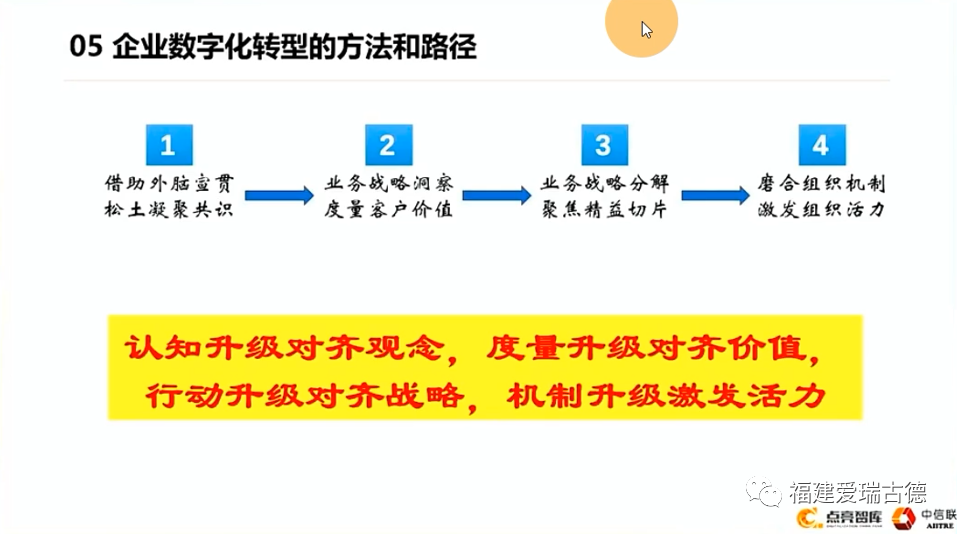 以企業(yè)塑造轉(zhuǎn)型的方法路徑來作為一個建議。首先第一個是一定要借助外腦進(jìn)行宣貫,松土凝聚共識也非常重要。相當(dāng)于我們改革開放如果沒有真理大辯論,是不可能有改革開放。第二個是業(yè)務(wù)戰(zhàn)略洞察,關(guān)注客戶價值,度量客戶價值。所有做的事最終要變現(xiàn)是要從客戶那去創(chuàng)造價值,去變現(xiàn)。所以做這個事,到底給客戶增加什么價值是需要考慮的。第三個業(yè)務(wù)戰(zhàn)略分解,聚焦精益切片,不要搞得太大了,一定要很小的切口。然后一定要前后端貫通,前后端、端到端的流程。第四個是磨合組織機制,激發(fā)組織活力,這是非常關(guān)鍵的一點。簡單一句話就是認(rèn)知升級,對其度量觀念升級,對其價值行動升級,對戰(zhàn)略機制升級激發(fā)活力。