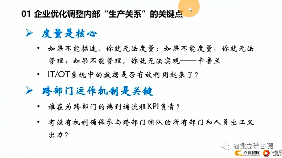 為什么說可以加速企業(yè)的數(shù)字化轉(zhuǎn)型,比如剛才說從生產(chǎn)力、生產(chǎn)關(guān)系角度,尤其是中央說數(shù)據(jù)是一種(新型)生產(chǎn)要素,我們的數(shù)據(jù)是趴在系統(tǒng)里頭了還是開發(fā)利用出來了?所以要調(diào)整企業(yè)內(nèi)部的生產(chǎn)關(guān)系,關(guān)鍵點是什么呢?有幾個。其中度量是核心。這一定要把價值度量想清楚,也是上次跟CIO有一個會(注:數(shù)字化與可持續(xù)發(fā)展暨福建CIO網(wǎng)20周年大會),在福建組織的,其中很有意思的是組織了一個CIO的辯論賽。說到數(shù)字化轉(zhuǎn)型的價值能不能度量,分成正反兩方。有人說不能度量,說覺得不能度量的很清楚,這個只能是度量出來少了幾個人減員增效。可以度量的也說不清楚,就是說能度量的,但是他也說不清楚為什么?因為它基于傳統(tǒng)的直線職能制,站在一個部門的視角去看,他怎么也度量不出來。你只有站高一層——站在端到端的全流程角度,才能把數(shù)字化的價值度量出來。