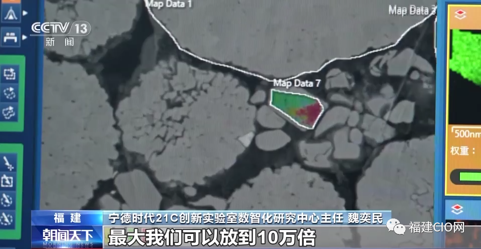 寧德時(shí)代21C創(chuàng)新實(shí)驗(yàn)室數(shù)智化研究中心主任魏奕民:這屏幕上就是材料顆粒內(nèi)部的一些微結(jié)構(gòu),最大我們可以放到10萬倍。我們現(xiàn)在就是在致力于在改進(jìn)它的能量密度、它的充放電性能、它的壽命。