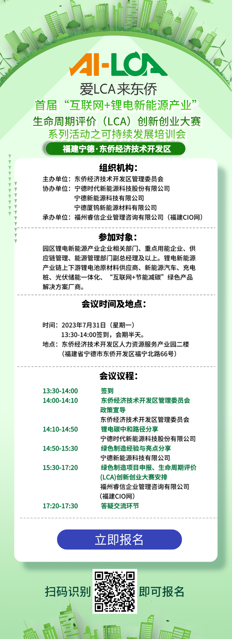 寧德時(shí)代和寧德新能源的低碳供應(yīng)鏈實(shí)踐,不僅帶來(lái)了環(huán)境效益,也為其他企業(yè)提供了成功的示范。在福建省發(fā)布的“電動(dòng)福建”發(fā)展規(guī)劃的背景下【今年6月,福建省工業(yè)和信息化廳等十部門(mén)關(guān)于印發(fā)全面推進(jìn)“電動(dòng)福建”建設(shè)的實(shí)施意見(jiàn)(2023-2025年)的通知發(fā)布。《實(shí)施意見(jiàn)》提出培育壯大新能源汽車產(chǎn)業(yè)鏈、加大新能源汽車推廣應(yīng)用力度、推動(dòng)電動(dòng)船舶全產(chǎn)業(yè)鏈發(fā)展、支持企業(yè)研發(fā)與創(chuàng)新、拓展完善產(chǎn)業(yè)生態(tài)、推進(jìn)充(換)電及加氫設(shè)施建設(shè)、營(yíng)造有利發(fā)展環(huán)境、加強(qiáng)“電動(dòng)福建”平臺(tái)建設(shè)和管理、加強(qiáng)保障措施等9條措施】,東僑鋰電新能源產(chǎn)業(yè)的發(fā)展尤為重要。本次“互聯(lián)網(wǎng)+鋰電新能源產(chǎn)業(yè)”生命周期評(píng)價(jià)(LCA)創(chuàng)新創(chuàng)業(yè)大賽系列活動(dòng)之可持續(xù)發(fā)展培訓(xùn)會(huì),將為行業(yè)內(nèi)的專業(yè)人士提供一個(gè)交流平臺(tái),共同探討“綠色低碳、數(shù)字賦能”的發(fā)展路徑。