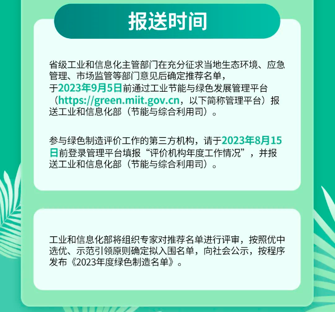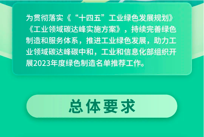 為貫徹落實《“十四五”工業(yè)綠色發(fā)展規(guī)劃》《工業(yè)領域碳達峰實施方案》,持續(xù)完善綠色制造和服務體系,推進工業(yè)綠色發(fā)展,助力工業(yè)領域碳達峰碳中和,現(xiàn)組織開展2023年度綠色制造名單推薦工作。有關事項通知如下: