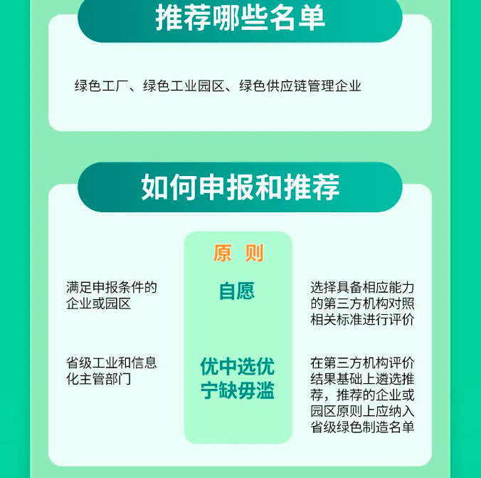 本年度綠色制造名單推薦包括綠色工廠、綠色工業(yè)園區(qū)、綠色供應鏈管理企業(yè),滿足申報條件的企業(yè)或園區(qū)按照自愿的原則,選擇具備相應能力的第三方機構對照相關標準進行評價。省級工業(yè)和信息化主管部門按照“優(yōu)中選優(yōu)、寧缺毋濫”的原則,在第三方機構評價結果基礎上遴選推薦,推薦的企業(yè)或園區(qū)原則上應納入省級綠色制造名單。