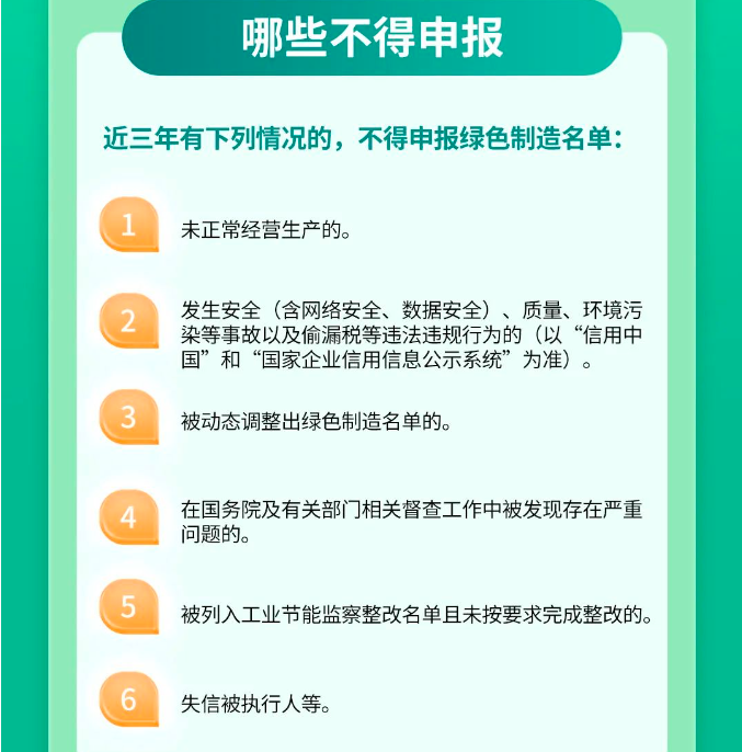 近三年有下列情況的,不得申報綠色制造名單:未正常經(jīng)營生產(chǎn)的;發(fā)生安全(含網(wǎng)絡安全、數(shù)據(jù)安全)、質(zhì)量、環(huán)境污染等事故以及偷漏稅等違法違規(guī)行為的(以“信用中國”和“國家企業(yè)信用信息公示系統(tǒng)”為準);被動態(tài)調(diào)整出綠色制造名單的;在國務院及有關部門相關督查工作中被發(fā)現(xiàn)存在嚴重問題的;被列入工業(yè)節(jié)能監(jiān)察整改名單且未按要求完成整改的;失信被執(zhí)行人等。