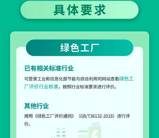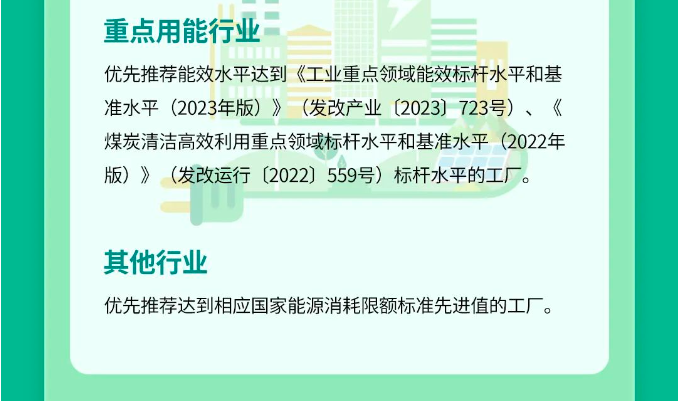 ?已發(fā)布綠色工廠評價行業(yè)標準的(可登錄工業(yè)和信息化部節(jié)能與綜合利用司網(wǎng)站查看),按照行業(yè)標準要求進行評價,其他行業(yè)按照《綠色工廠評價通則》(GB/T36132-2018)進行評價。為發(fā)揮綠色工廠節(jié)能降碳引領作用,重點用能行業(yè)優(yōu)先推薦能效水平達到《工業(yè)重點領域能效標桿水平和基準水平(2023年版)》(發(fā)改產(chǎn)業(yè)〔2023〕723號)、《煤炭清潔高效利用重點領域標桿水平和基準水平(2022年版)》(發(fā)改運行〔2022〕559號)標桿水平的工廠,其他行業(yè)優(yōu)先推薦達到相應國家能源消耗限額標準先進值的工廠。