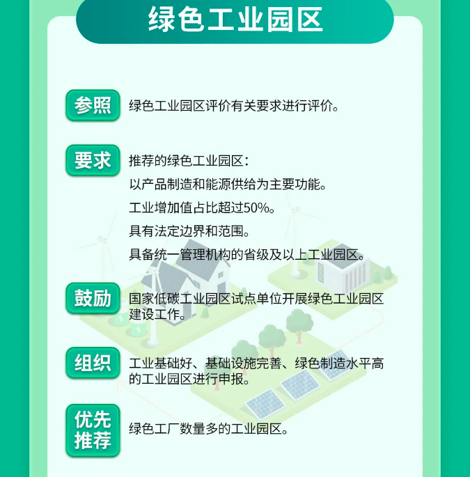 ?參照綠色工業(yè)園區(qū)評價有關要求進行評價,推薦的綠色工業(yè)園區(qū)是以產(chǎn)品制造和能源供給為主要功能、工業(yè)增加值占比超過50%、具有法定邊界和范圍、具備統(tǒng)一管理機構的省級及以上工業(yè)園區(qū),鼓勵國家低碳工業(yè)園區(qū)試點單位開展綠色工業(yè)園區(qū)建設工作。各地區(qū)要組織工業(yè)基礎好、基礎設施完善、綠色制造水平高的工業(yè)園區(qū)進行申報,優(yōu)先推薦綠色工廠數(shù)量多的工業(yè)園區(qū)。