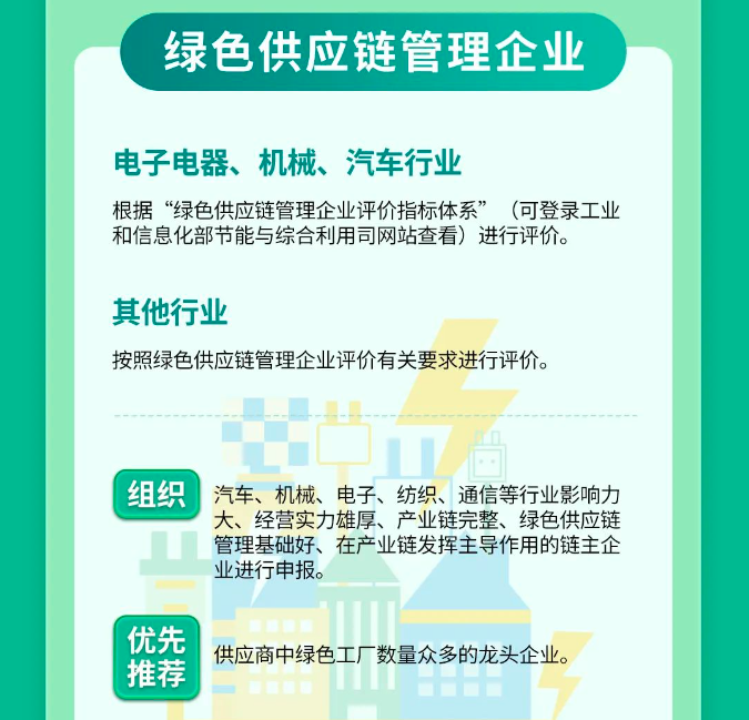 ?電子電器、機械、汽車等3個行業(yè)企業(yè),根據(jù)“綠色供應鏈管理企業(yè)評價指標體系”(可登錄工業(yè)和信息化部節(jié)能與綜合利用司網(wǎng)站查看)進行評價,其他行業(yè)按照綠色供應鏈管理企業(yè)評價有關要求進行評價。各地區(qū)要組織汽車、機械、電子、紡織、通信等行業(yè)影響力大、經(jīng)營實力雄厚、產(chǎn)業(yè)鏈完整、綠色供應鏈管理基礎好、在產(chǎn)業(yè)鏈發(fā)揮主導作用的鏈主企業(yè)進行申報,優(yōu)先推薦供應商中綠色工廠數(shù)量眾多的龍頭企業(yè),優(yōu)先支持汽車產(chǎn)品生產(chǎn)者責任延伸試點企業(yè)。