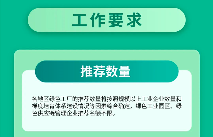 各地區(qū)綠色工廠的推薦數(shù)量將按照規(guī)模以上工業(yè)企業(yè)數(shù)量和梯度培育體系建設情況等因素綜合確定,綠色工業(yè)園區(qū)、綠色供應鏈管理企業(yè)推薦名額不限。省級工業(yè)和信息化主管部門在充分征求當?shù)厣鷳B(tài)環(huán)境、應急管理、市場監(jiān)管等部門意見后確定推薦名單,于2023年9月5日前通過工業(yè)節(jié)能與綠色發(fā)展管理平臺(https://green.miit.gov.cn,以下簡稱管理平臺)報送工業(yè)和信息化部(節(jié)能與綜合利用司)。我部將組織專家對推薦名單進行評審,按照優(yōu)中選優(yōu)、示范引領原則確定擬入圍名單,向社會公示,按程序發(fā)布《2023年度綠色制造名單》。
