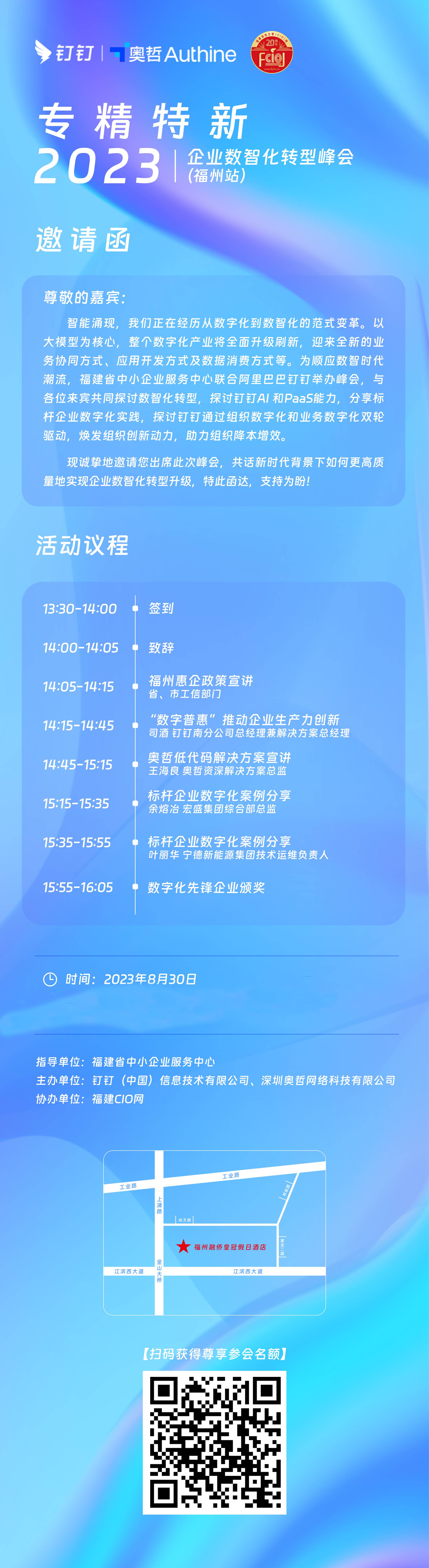 福建CIO網(wǎng)于8月30日在福州協(xié)辦開展2023企業(yè)數(shù)智化轉(zhuǎn)型峰會,此次峰會是福州工信聯(lián)合釘釘舉辦,會議現(xiàn)場釘釘會最新發(fā)布和現(xiàn)場演示釘釘AI辦公能力,同時這次也邀請了宏盛集團和寧德新能源進行現(xiàn)場分享,寧德新能源也是第一次在大會上去分享怎么用低代碼解決內(nèi)部業(yè)務(wù)流程和使用場景,現(xiàn)誠摯地邀請您出席此次峰會,共話新時代背景下如何更高質(zhì)量地實現(xiàn)企業(yè)數(shù)智化轉(zhuǎn)型升級,參會名額有限,可掃描海報二維碼報名。