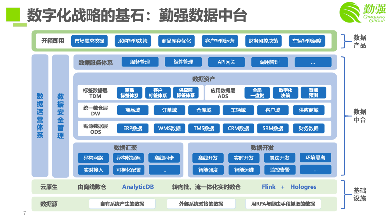 基于我的理解,信息化底層是ERP,數(shù)字化底層就是數(shù)據(jù)中臺(tái),有了這兩個(gè)非常穩(wěn)健的底層的支持,在上游就可以做很多智能化的應(yīng)用,去給各項(xiàng)業(yè)務(wù)去做降本增效,去帶來(lái)收入。比如財(cái)務(wù)數(shù)字化、采購(gòu)智能化、城配智能化、銷售智能化和經(jīng)營(yíng)智能化,歸根結(jié)底是要支撐上游業(yè)務(wù)的采購(gòu)、倉(cāng)儲(chǔ)、銷售和配送。所有的建設(shè)都是跟上游應(yīng)用是密不可分的關(guān)系。