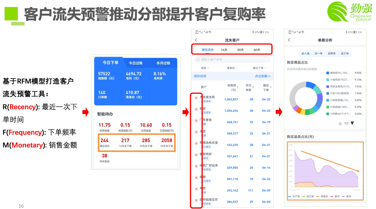 所有銷售人員都有手機(jī)端的經(jīng)營(yíng)管理工具,他們會(huì)直觀的看到每天有多少潛在流失,需要根據(jù)趨勢(shì)提醒及時(shí)的介入挽回客戶。在潛在流失客戶里面,所有的業(yè)務(wù)人員需要知道哪些客戶相對(duì)更重要的、主要在買什么產(chǎn)品、哪些產(chǎn)品最終出現(xiàn)銷售額的下滑,分析原因并及時(shí)地去回訪,維護(hù)好客情,那業(yè)務(wù)就能會(huì)實(shí)現(xiàn)比較穩(wěn)定的銷售。