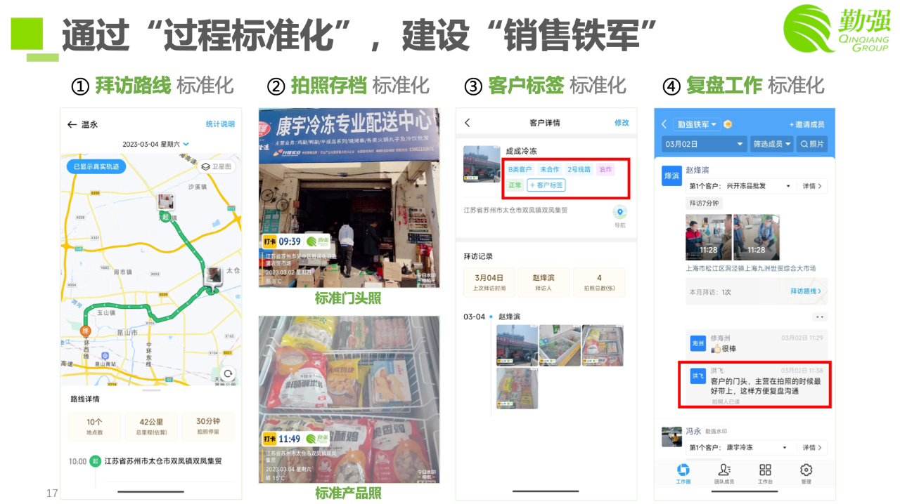 另外一個(gè)銷售場(chǎng)景,在快消品行業(yè)很典型的地推場(chǎng)景,引入到供應(yīng)鏈領(lǐng)域時(shí),像快消品一樣,會(huì)涉及大量的渠道、大量的門店,一定要管好地推業(yè)務(wù)員:每天到底跑了多少個(gè)地方、到底這個(gè)地方有沒(méi)有產(chǎn)生動(dòng)銷行為、有沒(méi)有把樣品鋪進(jìn)去。所以我們會(huì)通過(guò)四個(gè)標(biāo)準(zhǔn)化,把我們所有分部的業(yè)務(wù)人員,以及我們地推人員的工作全部都固化下來(lái)。