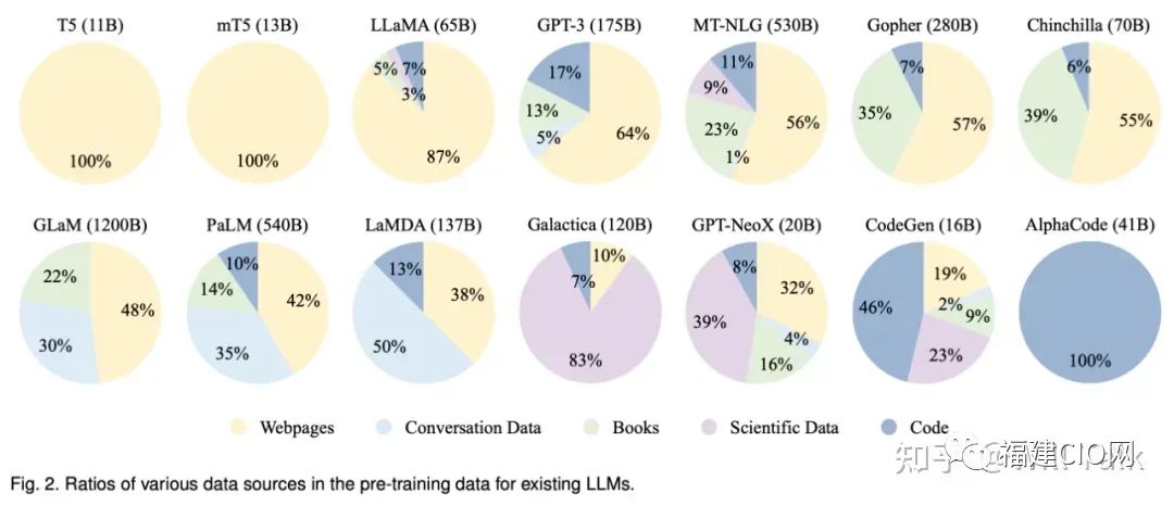 因此,要開發(fā)一個強(qiáng)大的大語言模型,首先要面對解決的是收集大量的自然語言語料進(jìn)行訓(xùn)練。據(jù)相關(guān)資料顯示GPT-3訓(xùn)練的語料量就高達(dá)45TB。注意這是文本類型的語料,想想我們一純文本的電子書才多少KB。并且語料的來源應(yīng)該是也多樣化的,可以從公共數(shù)據(jù)看到一些大模型語言語料庫的來源占比。從GPT-3的模型可以看到其中64%的訓(xùn)練數(shù)據(jù)來源于網(wǎng)頁,17%的訓(xùn)練數(shù)據(jù)來源于代碼,13%的電子書,5%來源于對話數(shù)據(jù)。