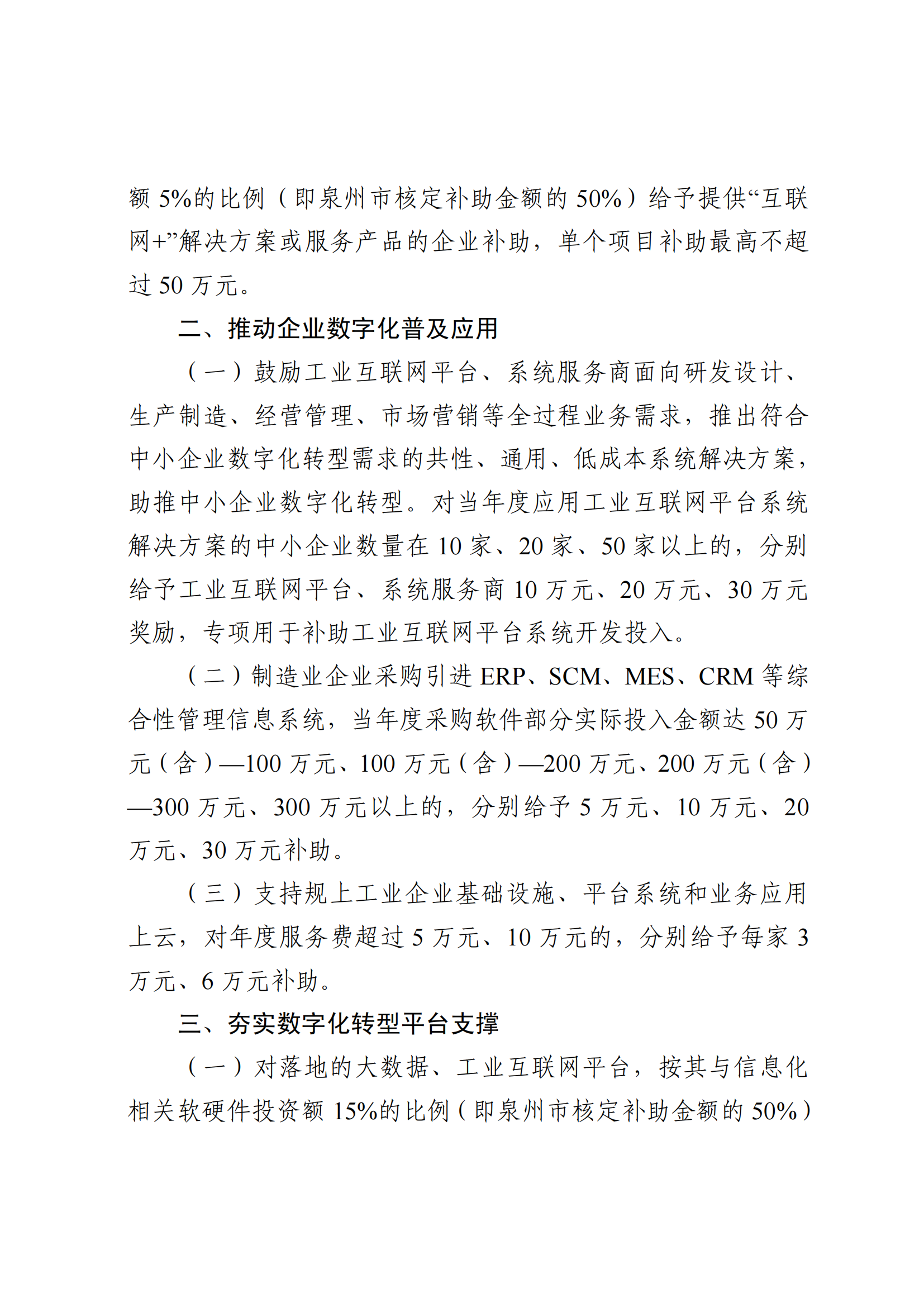 2. 制造業(yè)企業(yè)采購引進ERP、SCM、MES、CRM等綜合性管理信息系統(tǒng),當年度采購軟件部分實際投入金額達50萬元(含)—100萬元、100萬元(含)—200萬元、200萬元(含)—300萬元、300萬元以上的,分別給予5萬元、10萬元、20萬元、30萬元補助。