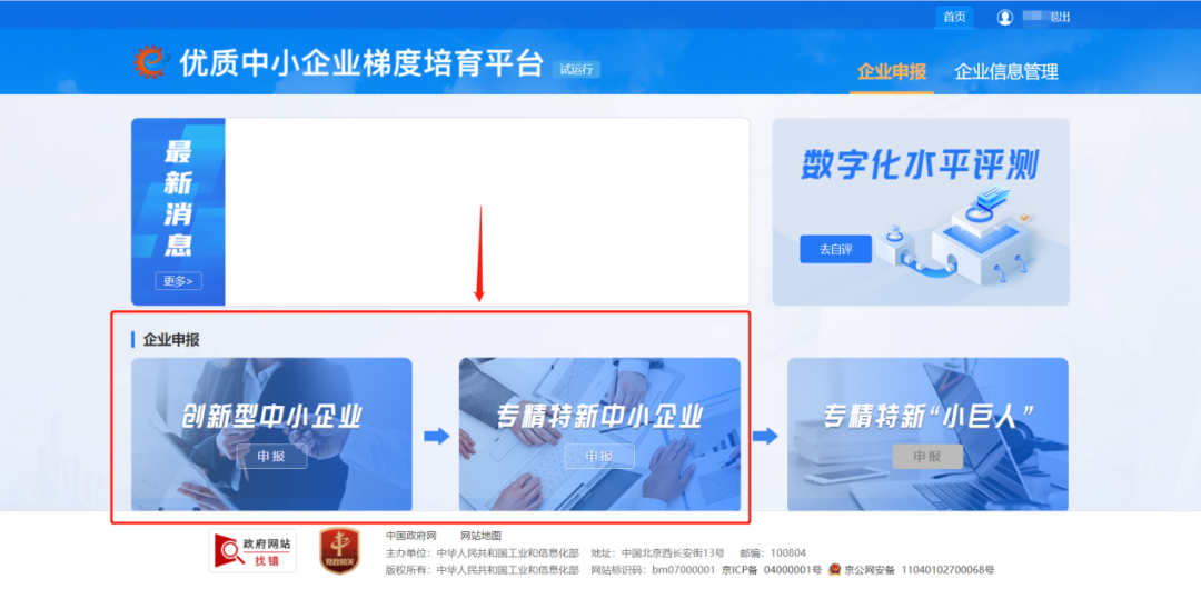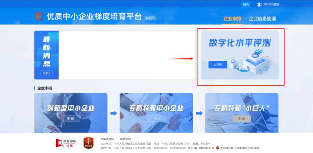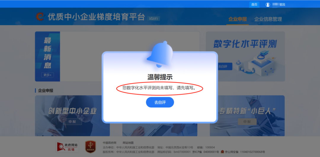 溫馨提醒:進行專精特新中小企業(yè)申報前必須先完成數(shù)字化水平評測,否則會出現(xiàn)如下頁面。