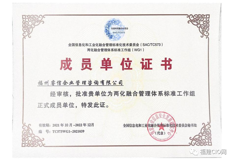 現(xiàn)為全國信息化和工業(yè)化融合管理標準化技術(shù)委員會(SAC/TC573)兩化融合管理體系標準工作組(WG1)正式成員單位;中關(guān)村信息技術(shù)與實體經(jīng)濟融合發(fā)展聯(lián)盟(原工信部中國信息化和工業(yè)化融合咨詢服務(wù)聯(lián)盟)18家發(fā)起理事單位,工信部中國首席信息官聯(lián)盟理事單位,中國電子節(jié)能技術(shù)協(xié)會全生命周期綠色管理(LCA)專業(yè)委員會會員單位;中國互聯(lián)網(wǎng)產(chǎn)業(yè)發(fā)展聯(lián)盟會員單位;福建省數(shù)字經(jīng)濟促進會能力提升專業(yè)委員會副主任單位。主要參與起草國家標準《工業(yè)互聯(lián)網(wǎng)平臺 企業(yè)應(yīng)用水平與績效評價》(GB/T 41870-2022)、《信息化和工業(yè)化融合管理體系 供應(yīng)鏈數(shù)字化管理指南》(GB/T 23050-2022)。2015年、2016年連續(xù)獲評兩化融合管理體系優(yōu)秀貫標咨詢服務(wù)機構(gòu);2022年入選江西省制造業(yè)數(shù)字化轉(zhuǎn)型服務(wù)商名單;中關(guān)村信息技術(shù)和實體經(jīng)濟融合發(fā)展聯(lián)盟(“中信聯(lián)”)2023年度首次兩化融合管理體系咨詢機構(gòu)評級AAA-(全國AAA檔評級結(jié)果共計14家)。