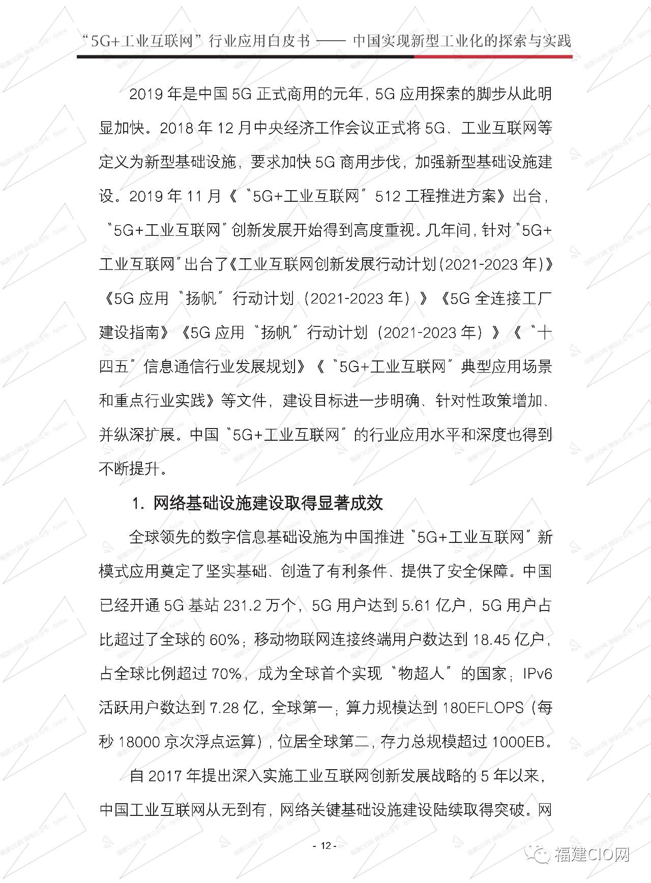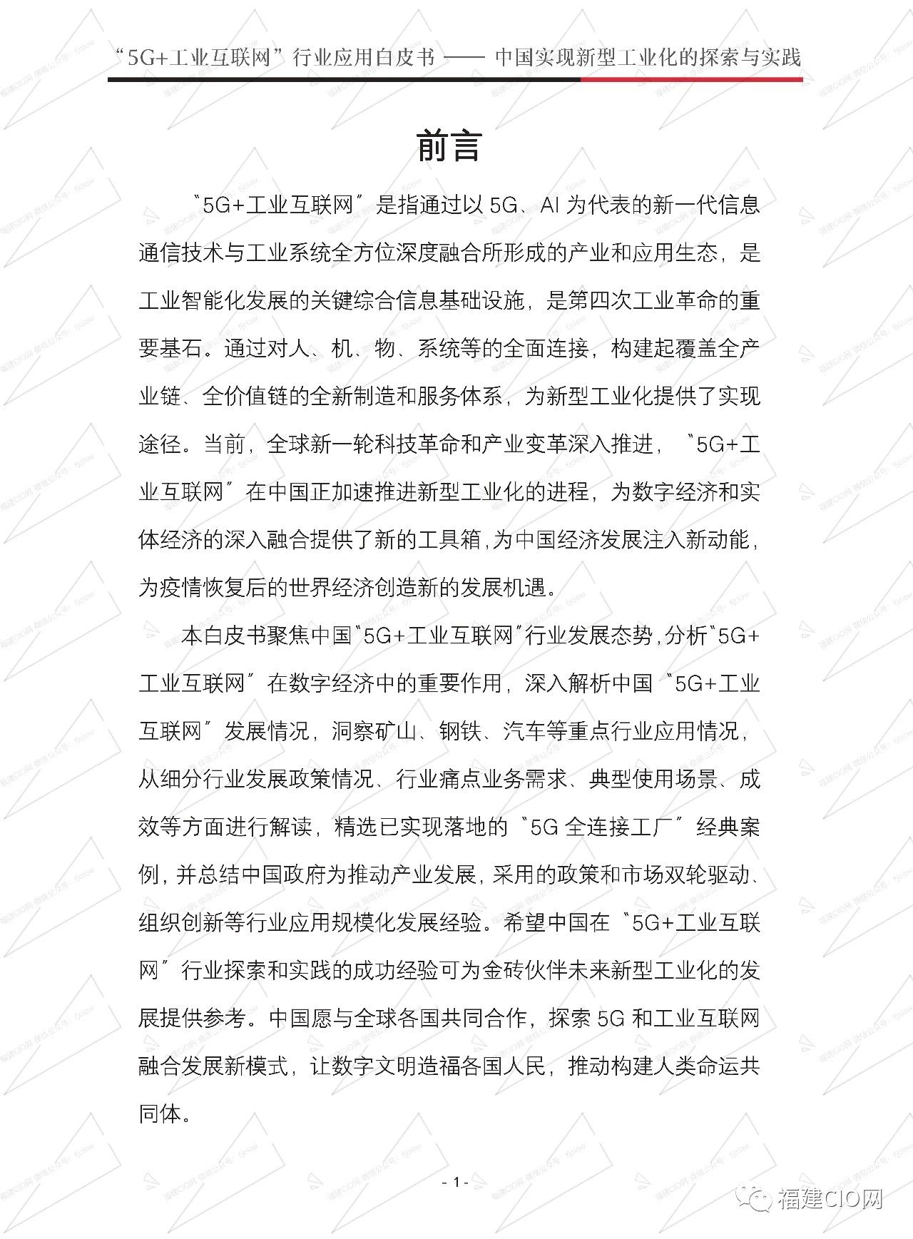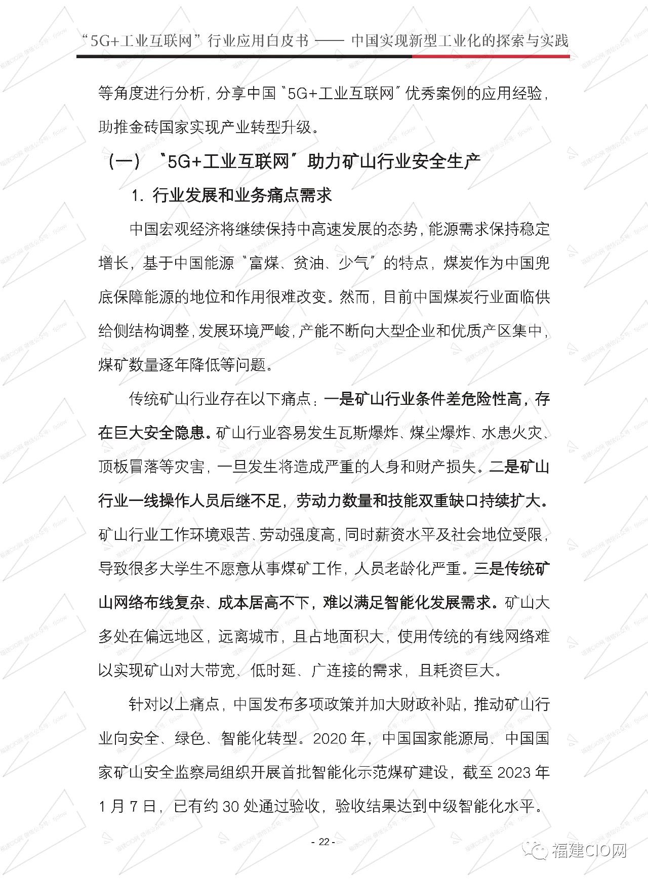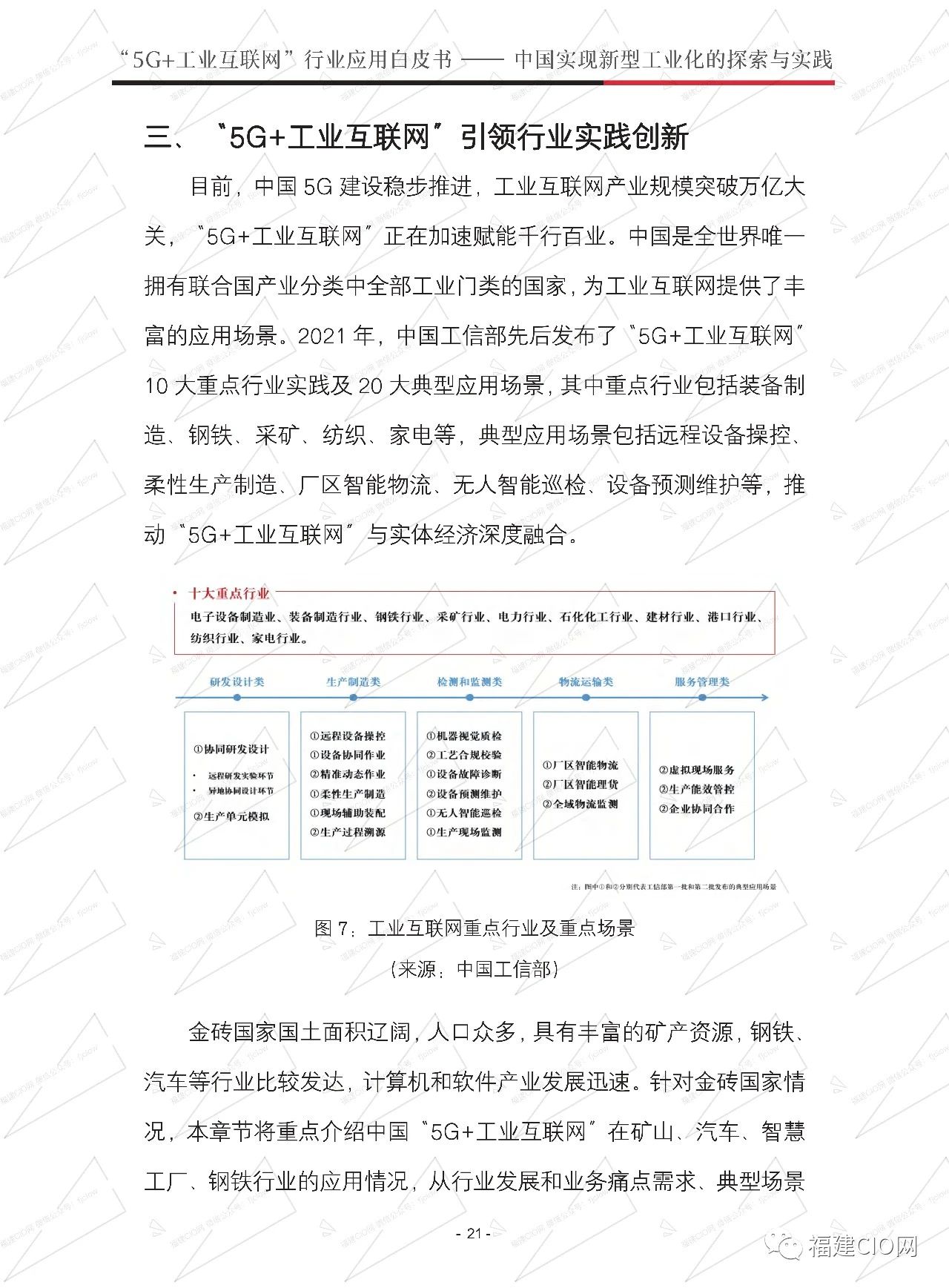本白皮書(shū)聚焦中國(guó)“5G+工業(yè)互聯(lián)網(wǎng)”行業(yè)發(fā)展態(tài)勢(shì),分析“5G+工業(yè)互聯(lián)網(wǎng)”在數(shù)字經(jīng)濟(jì)中的重要作用,深入解析中國(guó)“5G+工業(yè)互聯(lián)網(wǎng)”發(fā)展情況,洞察礦山、鋼鐵、汽車(chē)等重點(diǎn)行業(yè)應(yīng)用情況,從細(xì)分行業(yè)發(fā)展政策情況、行業(yè)痛點(diǎn)業(yè)務(wù)需求、典型使用場(chǎng)景、成效等方面進(jìn)行解讀,精選已實(shí)現(xiàn)落地的“5G全連接工廠”經(jīng)典案例,并總結(jié)中國(guó)政府為推動(dòng)產(chǎn)業(yè)發(fā)展,采用的政策和市場(chǎng)雙輪驅(qū)動(dòng)、組織創(chuàng)新等行業(yè)應(yīng)用規(guī)?;l(fā)展經(jīng)驗(yàn)。希望中國(guó)在“5G+工業(yè)互聯(lián)網(wǎng)”行業(yè)探索和實(shí)踐的成功經(jīng)驗(yàn)可為金磚伙伴未來(lái)新型工業(yè)化的發(fā)展提供參考。中國(guó)愿與全球各國(guó)共同合作,探索5G和工業(yè)互聯(lián)網(wǎng)融合發(fā)展新模式,讓數(shù)字文明造福各國(guó)人民,推動(dòng)構(gòu)建人類(lèi)命運(yùn)共同體。