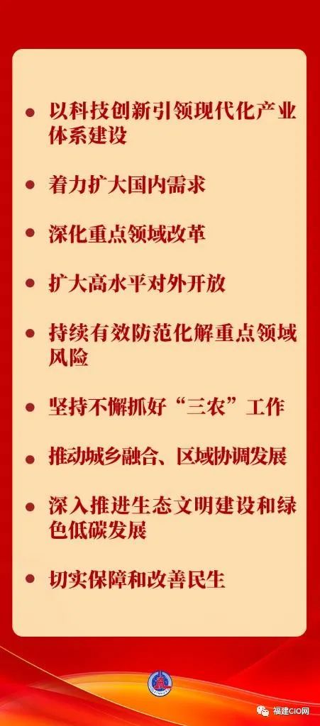擴(kuò)大高水平對(duì)外開放;持續(xù)有效防范化解重點(diǎn)領(lǐng)域風(fēng)險(xiǎn);堅(jiān)持不懈抓好“三農(nóng)”工作;推動(dòng)城鄉(xiāng)融合、區(qū)域協(xié)調(diào)發(fā)展;深入推進(jìn)生態(tài)文明建設(shè)和綠色低碳發(fā)展;切實(shí)保障和改善民生……