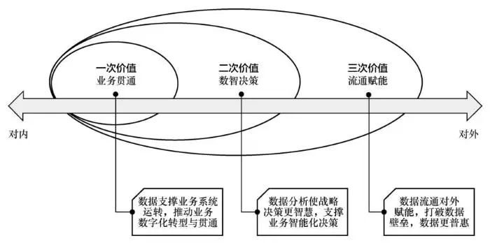 推動數(shù)據(jù)要素發(fā)展,是對當(dāng)今技術(shù)與產(chǎn)業(yè)背景的深刻把握,是搶抓數(shù)字經(jīng)濟時代國際競爭制高點的關(guān)鍵舉措。發(fā)展數(shù)據(jù)要素應(yīng)聚焦于數(shù)據(jù)要素價值的釋放。數(shù)據(jù)要素三次價值釋放規(guī)律突出了數(shù)據(jù)要素本身的作用機理,在一定程度上揭示出組織內(nèi)的數(shù)據(jù)業(yè)務(wù)開展與全社會的生產(chǎn)力提升之間的關(guān)系。關(guān)于數(shù)據(jù)要素及其價值釋放的基本規(guī)律還需要持續(xù)深入挖掘和闡釋,但數(shù)據(jù)要素的三次價值提示人們:數(shù)據(jù)要素發(fā)展是一項系統(tǒng)工程,既涉及組織內(nèi)部的數(shù)據(jù)應(yīng)用,又涉及全社會的普惠發(fā)展;既涉及數(shù)據(jù)資源的配置,又涉及數(shù)據(jù)對配置其他資源的作用。需要強調(diào)的是,雖然數(shù)據(jù)在流通中可以實現(xiàn)價值增值和飛躍,但是并不意味著如今已經(jīng)完全進入三次價值的階段。部分組織對數(shù)據(jù)應(yīng)用的感知仍然模糊,又受限于資金、人才、技術(shù)水平不足,覆蓋生產(chǎn)活動全流程、全產(chǎn)業(yè)鏈的數(shù)據(jù)鏈仍不完善,尚不具備業(yè)務(wù)數(shù)據(jù)電子化或分析決策智能化的能力。在這種條件下,這類組織即使引入外部數(shù)據(jù)也無法有效利用,無法形成回饋業(yè)務(wù)發(fā)展的價值回路。因此,數(shù)據(jù)要素發(fā)展需要統(tǒng)籌推進,一次價值和二次價值仍需要持續(xù)釋放,在更廣泛實現(xiàn)業(yè)務(wù)貫通和數(shù)智決策的基礎(chǔ)上,全面發(fā)揮數(shù)據(jù)流通對外賦能的價值。
