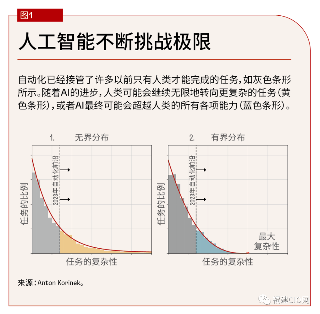 小圖1展示的觀點是:人腦解決更為復雜的任務的能力是無限的。這與我們自工業(yè)革命以來在經(jīng)濟方面的經(jīng)驗相一致:隨著自動化邊界的擴展,人類已經(jīng)實現(xiàn)了簡單任務(包括機械性任務和認知性任務)的自動化,并重新分配了勞動力來更多執(zhí)行余下的、更復雜的任務——也就是說,他們已經(jīng)進入了圖中所示的復雜性分布的右端尾部。簡單而直接的推斷表明,隨著AI的進步并讓越來越多的認知性任務實現(xiàn)自動化,這一過程將持續(xù)下去。