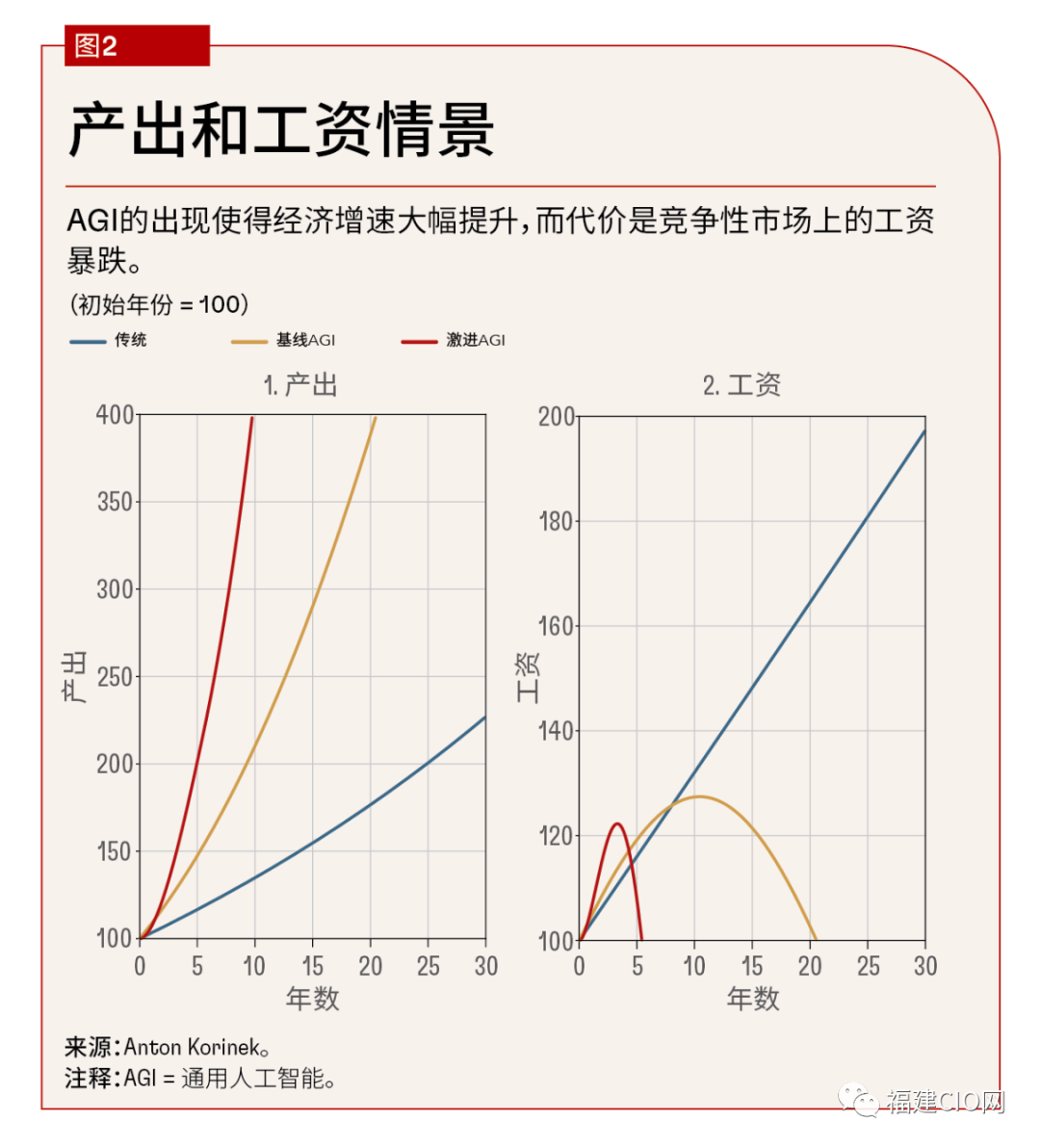 圖2大致描繪了前所未有的技術變革可能對宏觀經(jīng)濟產(chǎn)生的影響,但最好將其理解為對可能性的解釋,而不是精確的預測。需要關注許多注意事項。首先,該圖背后的模型是在一個勞動獲得有競爭力的回報的高效經(jīng)濟中建立的。與技術上的可能性相比,一系列因素可能會減緩AGI的推出,從組織摩擦、監(jiān)管法規(guī)和對資本積累的限制(如芯片供應鏈瓶頸)到實施AGI的社會性選擇。即使技術上可以取代人工,社會也可能選擇在某些職能上保留人工——例如牧師、法官或立法人員。由此產(chǎn)生的“懷舊”工作可以永久維持對人類勞動力的需求(Korinek 和 Juelfs)。?