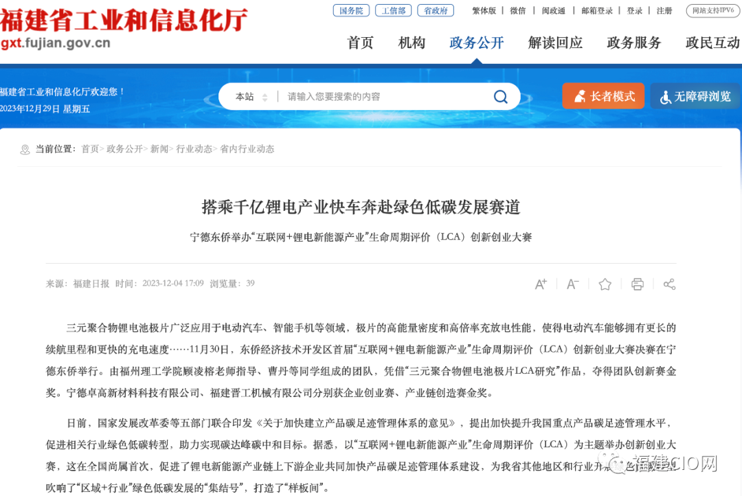 2023年11月30日,全國首屆“互聯(lián)網(wǎng)+鋰電新能源產(chǎn)業(yè)”生命周期評價(LCA)創(chuàng)新創(chuàng)業(yè)大賽決賽在福建寧德東僑經(jīng)濟技術開發(fā)區(qū)人力資源服務產(chǎn)業(yè)園成功舉行?;顒佑蓶|僑經(jīng)濟技術開發(fā)區(qū)管委會主辦,寧德時代新能源科技股份有限公司、寧德新能源科技有限公司、寧德廈鎢新能源材料有限公司共同協(xié)辦,福州睿信企業(yè)管理咨詢有限公司(福建CIO網(wǎng))承辦。大賽分為三個賽道,分別為團隊創(chuàng)新賽、企業(yè)創(chuàng)業(yè)賽、產(chǎn)業(yè)鏈創(chuàng)造賽。